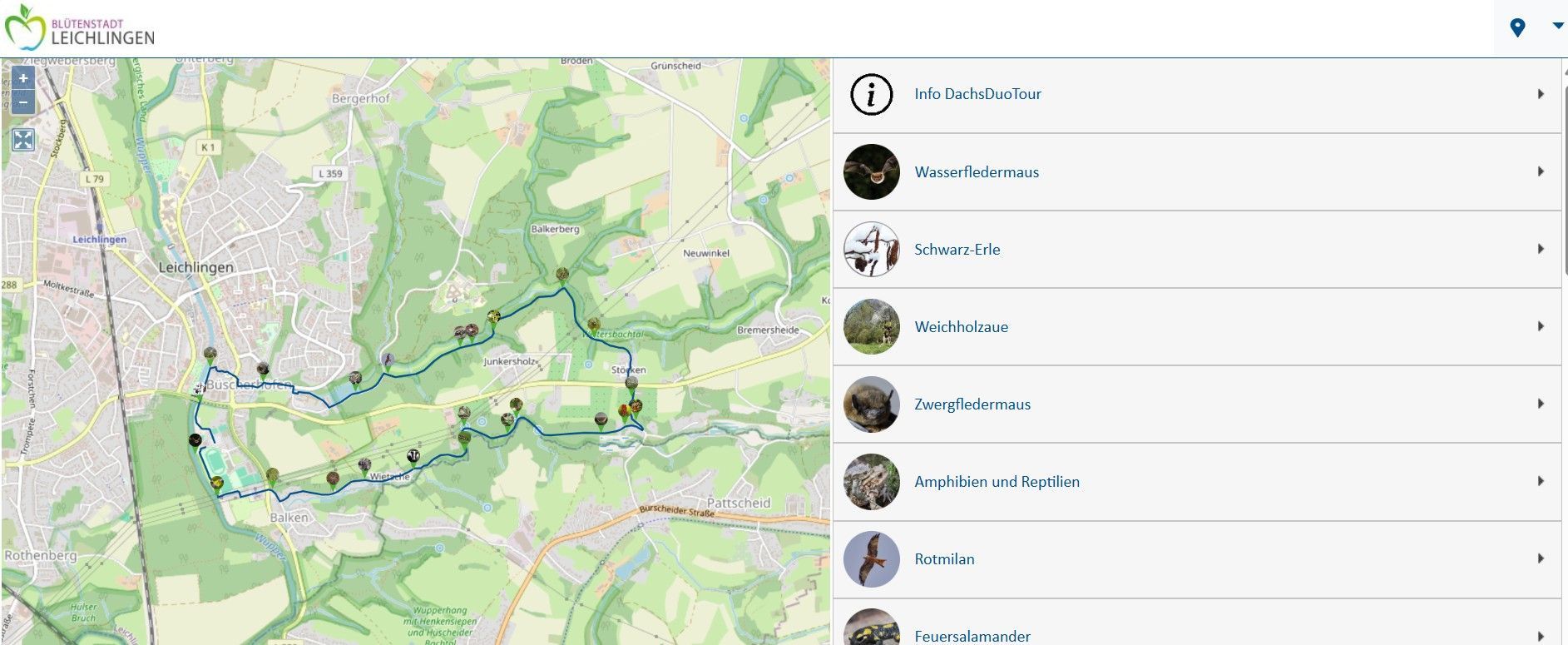 In einer fantastischen Zusammenarbeit mit der Klimaschutzmanagerin Frau Monika Meves von der Stadt Leichlingen und gefördert durch die Kreissparkasse Köln hatten wir die Chance, eine Erlebnistour zu konzipieren. 24 Infotafeln mit QR-Codes leiten Wanderer durch Leichlingen und informieren über Tiere, Pflanzen und Lebensräume. Schilder und Homepage sind nun installiert und laden zum Entdecken ein! DachsDuoTour Ein großer Dank an alle Helfer und Unterstützer!