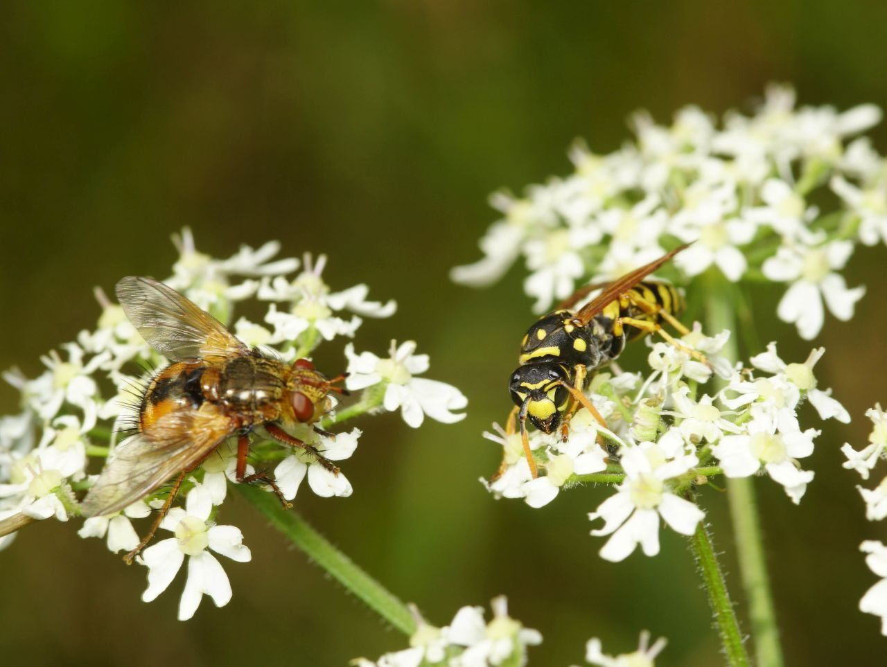 Auch im Spätsommer lassen sich noch interessante und schöne Insekten in Gronenborn beobachten. Besonders wenn es noch einmal warm und sonnig wird, tanzen in Gronenborn die Insekten. Neben Libellen wie Weidenjungfer, Heidelibelle und Mosaikjungfer sind auf den letzten Blüten besonders die Fliegen noch einmal aktiv. Die auffällige Igelfliege beispielsweise konnte dieses Jahr besonders oft beobachtet werden. Ihr Lebenszyklus erinnert an einen Horrorfilm: Die Fliegen legen ihre Eier an Nachtfalterraupen ab. Die Fliegenmade bohrt sich dann in die Raupe und verzehrt sie bei lebendigem Leibe von innen. Als sogenannte Raupenfliegen sind sie damit wichtige natürliche Gegenspieler auch zu schädlichen Schmetterlingsraupen.