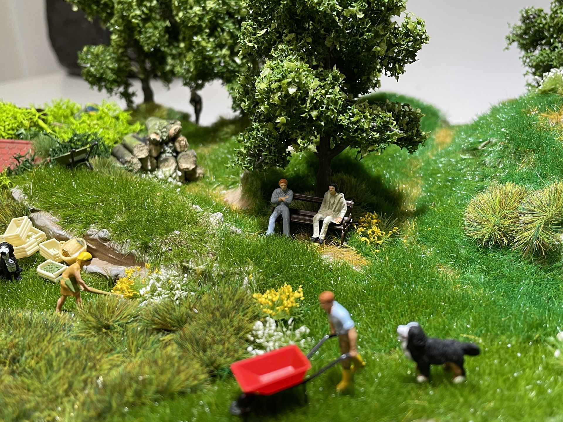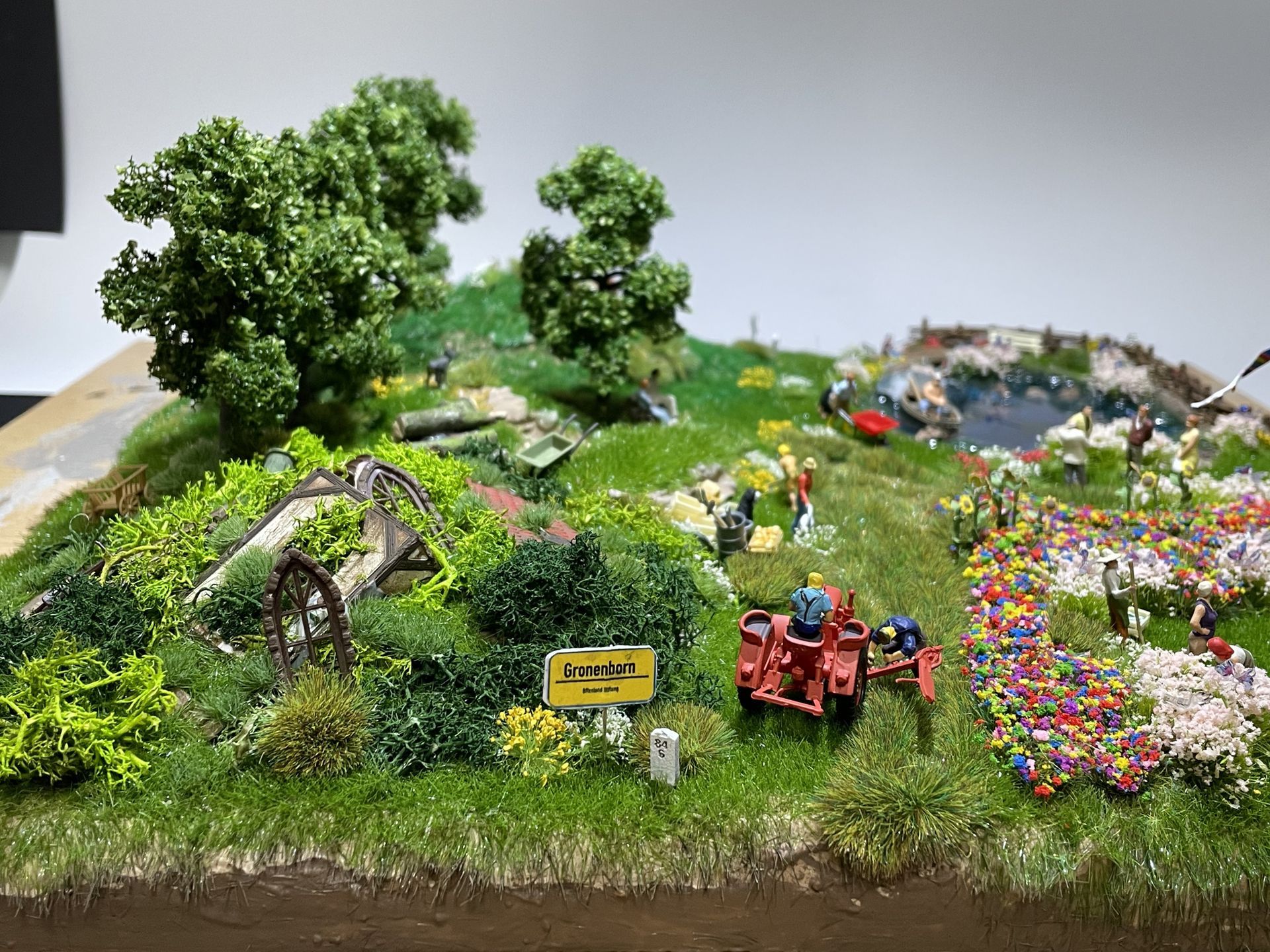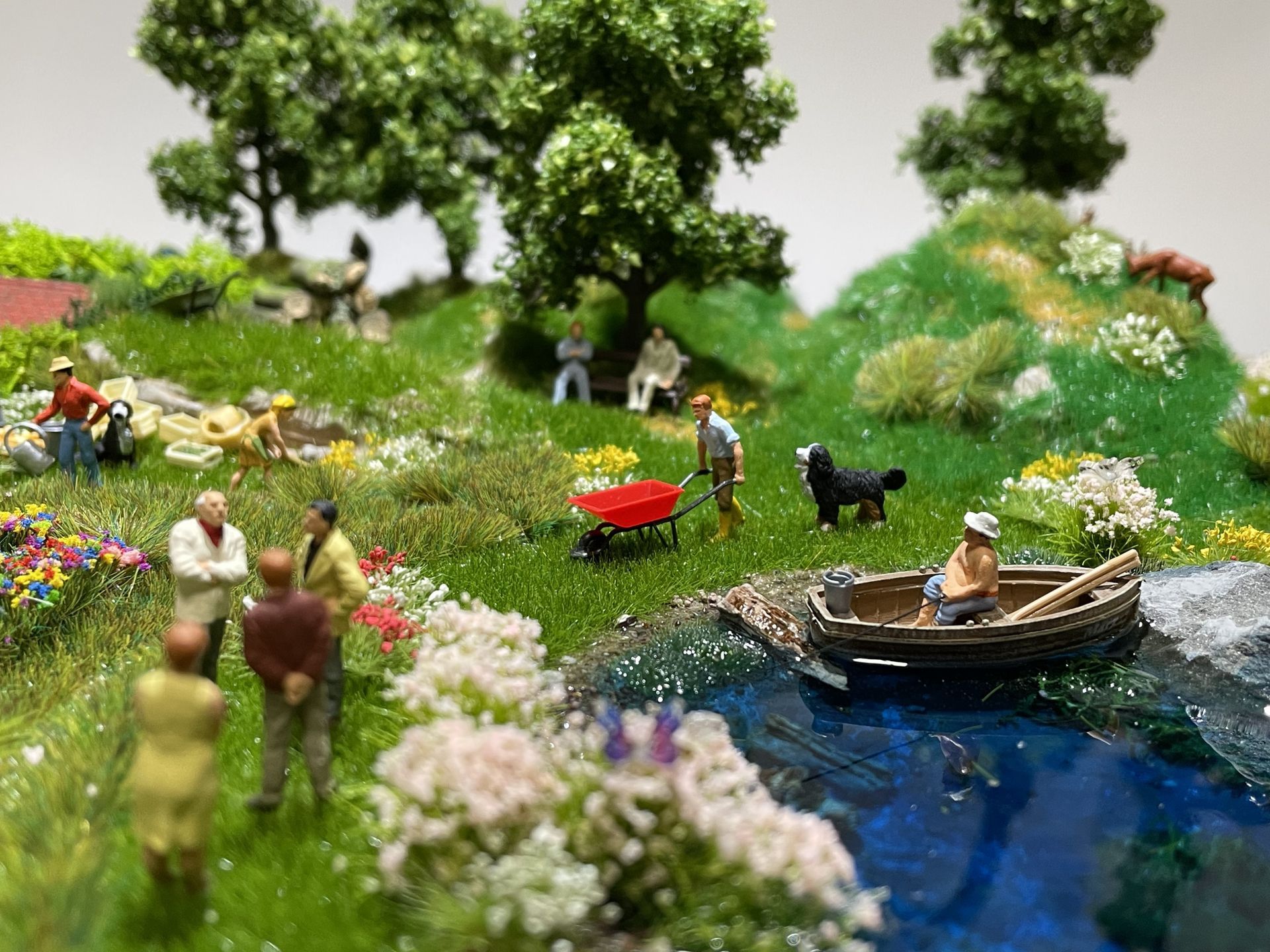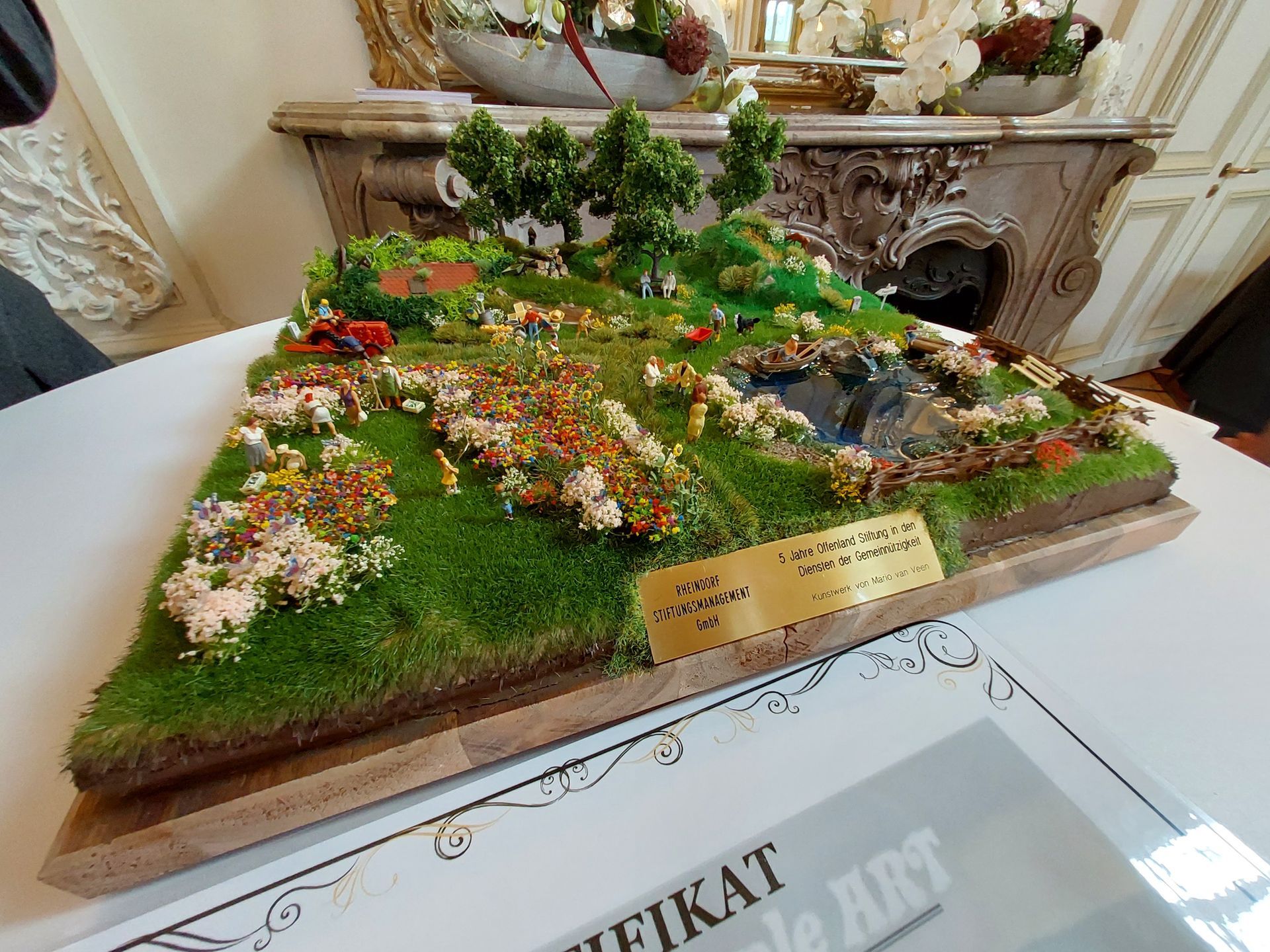 Eine besondere Überraschung war die Ehrung der Irlandfreunde und der Offenland Stiftung für deren / unser gemeinnütziges Engagement. Eine ganz außergewöhnliche Freude war es für uns den Preis dafür entgegenzunehmen: Wer Michael Rheindorf kennt, weiß auch, dass er eine besondere Freude an der Kunst des Fotografen Mario van Veen hat. Insbesondere sein Projekt „Little People“, bei dem menschliche Miniaturen auf fantasievolle, überraschende und liebevoll ironische Weise mit Alltagsgegenständen und in Alltagssituationen arrangiert werden, hat es uns allen angetan. Umso mehr haben wir uns darüber gefreut eine ganze von Mario van Veen gestaltete Miniaturlandschaft – ein stilisiertes Abbild des Naturschutzgebiets Gronenborner Teiche – mit zahlreichen, liebevollen Details erhalten zu haben (siehe Bilder). Wir bedanken uns ganz herzlich für dieses wunderschöne Kunstwerk!